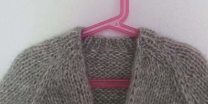 Nach einigen Reihen mit Raglanzunahmen und verkürzten Reihen beim vorderen Halsauschnitt sieht der Halsauschnitt dann so aus: